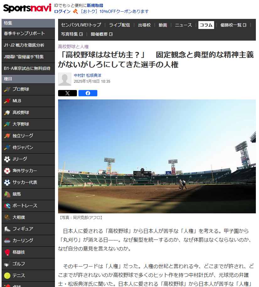 『高校野球と人権』がSportsnaviに掲載されました! 2025 2/21 セミナー・研究発表等 未分類 2025年2月21日 拙著『高校野球と人権』がSportsnaviに掲載されました! 10回にわたり拙著抜粋記事を取り上げて頂き、ハイライトのような構成になっています。 ぜひ、ご覧ください! 詳しくはこちらのページをご覧ください。 松坂典洋 弁護士・社会保険労務士 長年弁護士をしてきた結果、紛争が発生した後に対応するよりも、法制度を積極的に利用してビジネスモデルを構築し、リスク回避の仕組みを整備した方が、企業は利益を確保しやすく、持続的に発展することが出来ると確信しました。 「人手不足で悩んでいる」「社員が定着しない」等、一見法律が関与していない悩みでも、法的側面を含めた体制構築・整備を行うことで解決することが出来ます。 当事務所は、ビジネスのプロセスに着目し、経営者に寄り添い、悩みの解決を積極的にサポートします。 セミナー・研究発表等 未分類 スポーツ法 ハラスメント 人権 高校野球 よかったらシェアしてね! URLをコピーしました! 2024年野球書店大賞にノミネートされました! 産経新聞記事「高校野球に消えない暴力問題」に識者として協力しました。 関連記事 書店員がいま一番気になる本2025フェアに紹介されました 2025年10月20日 産経新聞記事「高校野球に消えない暴力問題」に識者として協力しました。 2025年10月16日 2024年野球書店大賞にノミネートされました! 2024年12月29日 共著「高校野球と人権」が出版されました! 2024年8月6日 公立高校の教員研修: 生徒関わりと法的視点の重要性 2024年6月15日 松坂弁護士のセミナーを聞いた感想 2016年3月29日